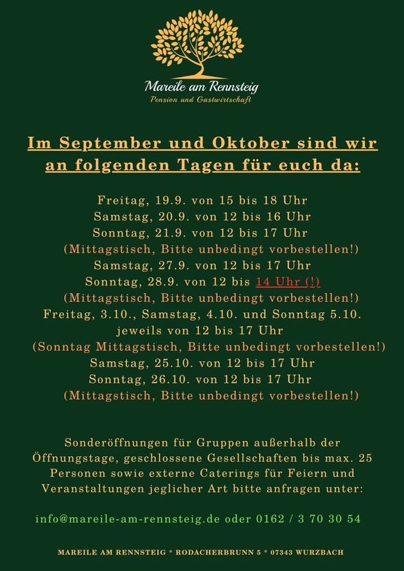 Anfragen bitte per eMail an info@mareile-am-rennsteig.de senden oder telefonisch unter 0162 / 37 03 054.